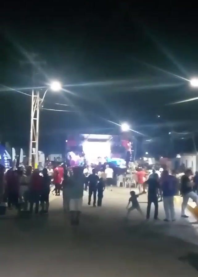 A low-angle nighttime view shows a crowd gathered in a paved area, possibly a street, facing a stage. The stage, equipped with speakers, lights, and an LED screen, is the focal point. People are seen standing, walking, and some appear to be dancing or moving to the music. Streetlights illuminate the scene, and buildings can be seen on the right side of the frame. The event appears to be a live music performance, festival, or community gathering.