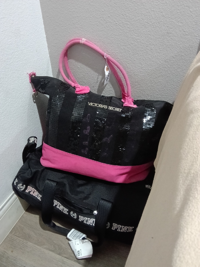 In Monterey Park, United States of America, two bags are positioned against a light-colored, textured wall in a corner, resting on a light brown wooden floor. The upper bag is a black Victoria's Secret tote, featuring vertical black sequin stripes, a solid pink fabric band across its lower section, and pink handles. A small white tag is attached to one of its handles. The lower bag is a black duffel bag, branded with multiple instances of the word "PINK" and the "PINK" dog logo in white. A silver zipper pull is visible on the lower bag's front pocket. A white tag, displaying "UA 1735" and "IAH UA578", lies on the wooden floor in front of the lower bag. A cream-colored fabric item is partially visible along the right edge of the frame. No individuals are present in the scene.