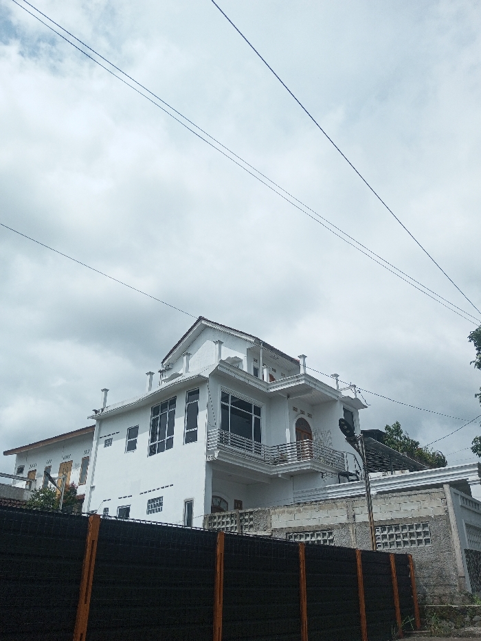 A modern, white two-story building stands under a cloudy sky, its design featuring large windows and a balcony with metal railings. A dark fence with orange posts obscures the lower portion of the building and a section of a gray concrete wall with decorative openings. Power lines crisscross the sky above, adding a geometric contrast to the natural cloudscape. Trees peek out from behind the building, suggesting a suburban or semi-rural setting.