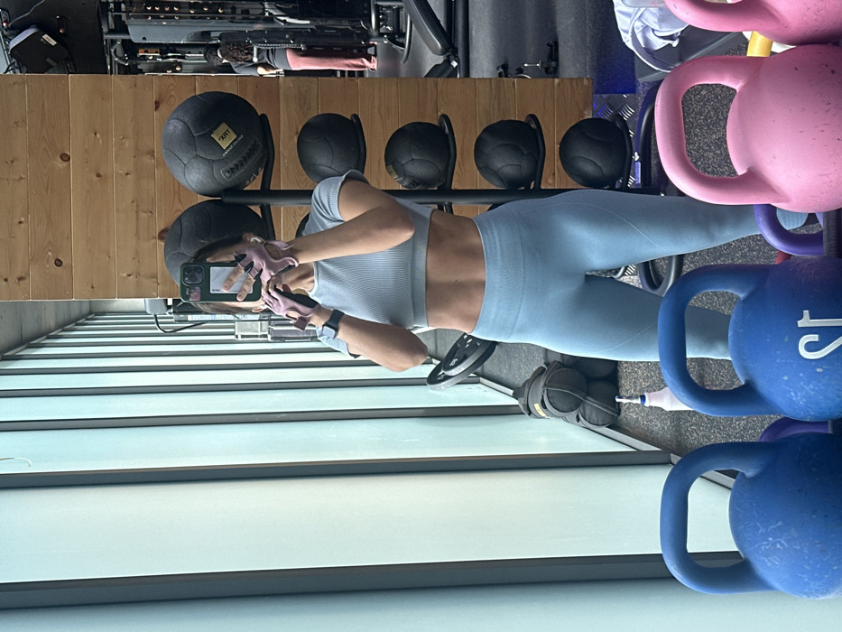 A woman in light blue workout attire stands in a gym, facing a mirrored wall. She holds a phone, capturing her reflection. Behind her, exercise equipment is visible: medicine balls on a rack, kettlebells stacked, and weight machines in the background. The floor is light, and the scene suggests a fitness environment.