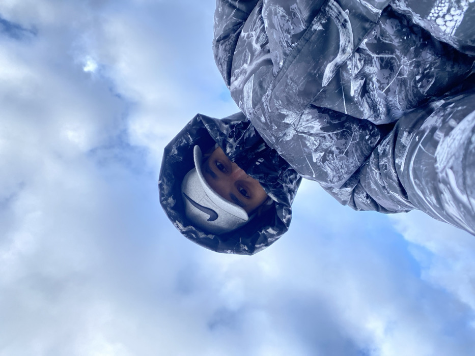 A person wearing a patterned gray and black hooded jacket and a white baseball cap with a black Nike swoosh is positioned in the upper half of the frame. Their eyes are visible beneath the hood and cap. The person is angled, appearing to look down towards the camera. The background is filled with a light blue sky containing wispy white clouds.