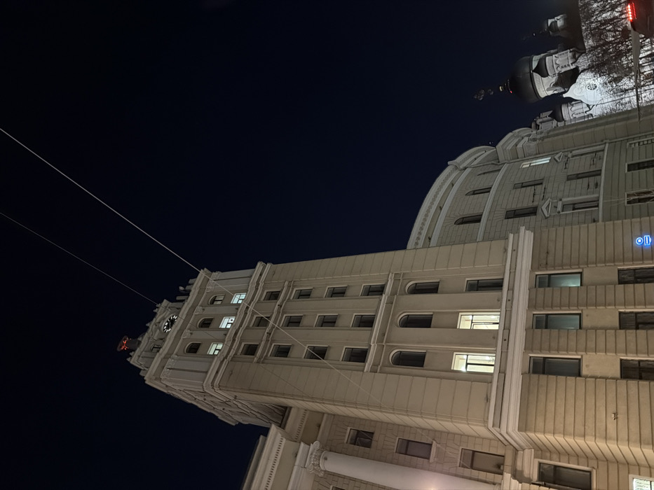 This image depicts an architectural scene at night in Voronezh, Russia, specifically featuring the Voronezh Oblast Duma building and the Annunciation Cathedral. The primary subject is the monumental, multi-story Voronezh Oblast Duma building, located on Revolution Avenue, which occupies the left and central portions of the frame. Constructed in the Stalinist Empire style, its light-colored facade is illuminated by artificial light against a dark, clear night sky. A prominent central tower rises vertically, featuring a visible clock face near its apex. At the very top of the tower, a red, illuminated hammer and sickle emblem is clearly discernible. Numerous windows, both rectangular and arched, are visible across the building's facade, with several on different levels glowing brightly from interior illumination. A classical-style portico with columns is partially visible on the far left. To the right of the Duma building, a curved architectural section transitions into the background, where the Annunciation Cathedral is visible. The cathedral is distinguished by its white walls, multiple dark onion domes, and golden Orthodox crosses atop them. Bare tree branches are partially visible in front of the cathedral. Two thin, parallel white wires traverse the upper left quadrant of the dark sky diagonally. At the bottom of the frame, faint red lights, likely from a passing vehicle, and a partially visible blue circular sign with a white icon are present, indicating a street-level perspective. No individuals or specific interactions are visible within the scene.