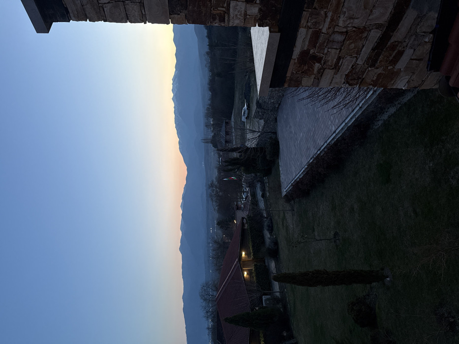 An elevated long shot depicts a twilight scene in Baldevo, Bulgaria, overlooking a valley with distant snow-capped mountains under a gradient sky transitioning from clear blue overhead to orange and pink at the horizon. In the foreground, the right side is dominated by a partial view of a building facade constructed from multi-toned natural stone blocks with a light-colored coping stone and a glimpse of a red-tiled roof at the bottom. Below and to the left of this structure, a neatly maintained lawn features a tall, slender evergreen tree. Adjacent to the lawn, a paved area of interlocking grey pavers extends, bordered by a dark hedge. In the midground, a building with a reddish-brown tiled roof and warm interior lighting is visible, surrounded by dark green hedges and sparse deciduous trees. A Bulgarian flag is displayed on a flagpole to the right of this building. Further into the midground, additional buildings with dark roofs are scattered, alongside more bare trees and stone walls. A light-colored utility vehicle is parked in an unpaved area to the right. The distant valley floor shows scattered artificial lights from a settlement, leading to the prominent mountain range forming the background. No individuals are visible in the scene.
