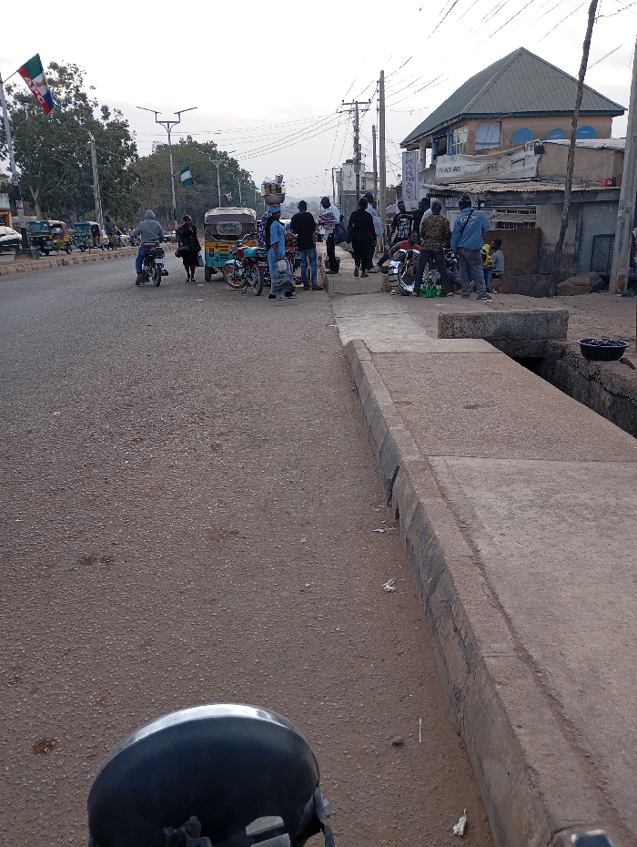 A bustling street scene shows pedestrians, motorcycles, and a three-wheeled vehicle. People are congregated on the sidewalk, near a building featuring a green, sloped roof. A person with a load balanced atop their head navigates the scene. Nigerian flags wave in the background. The image is likely taken from a motorcycle's point of view, as the motorcycle's headlight is visible in the foreground.