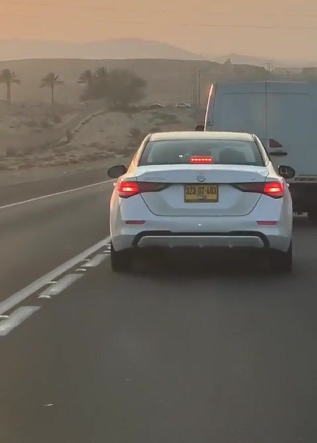 A brief video shows the rear of a white sedan with Israeli license plates driving on a highway. A white van is closely behind it. Other cars appear farther down the road. The road is lined with reflective lane markers. In the background is a desert landscape with sparse vegetation and distant mountains under a muted, hazy sky, possibly at sunrise or sunset.