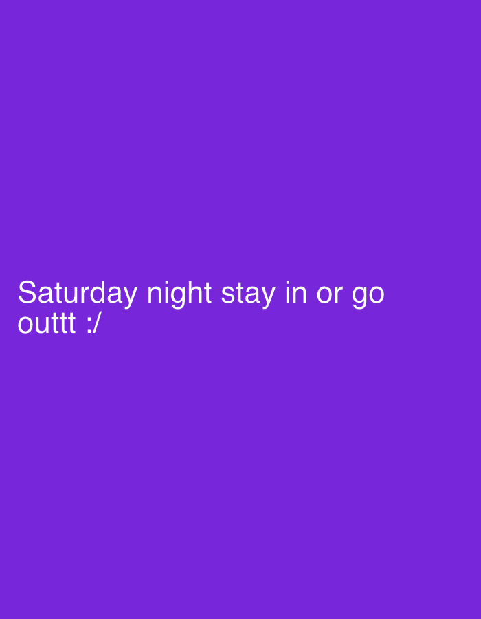 The image displays a solid, uniform purple background. White sans-serif text, "Saturday night stay in or go outtt :/", is positioned in the lower-left quadrant. No individuals, physical objects, specific actions, or interactions are depicted. The visual content of the image does not provide any identifying features or environmental context that would indicate a location within the city of Paris, France.