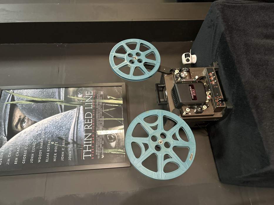 A framed movie poster for "The Thin Red Line" features a cast list, including Adrien Brody, Jim Caviezel, and John Travolta. Next to it are two light blue film reels and a Hanimex Eiki film projector. A white security camera is positioned near the projector. The background is a dark wall and a black, velvet-like surface. The projector and film reels suggest a setup for viewing movies in an older format.