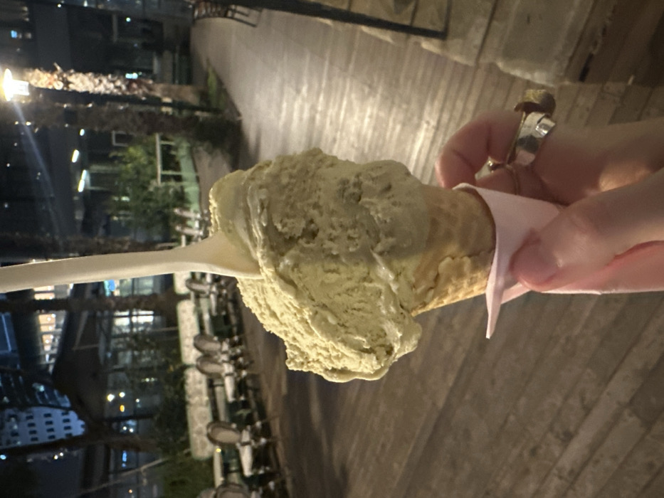 - "A hand holds a pistachio gelato cone, with a white plastic spoon poised to scoop" by FM-jqiIm2, licensed under CC BY 4.0