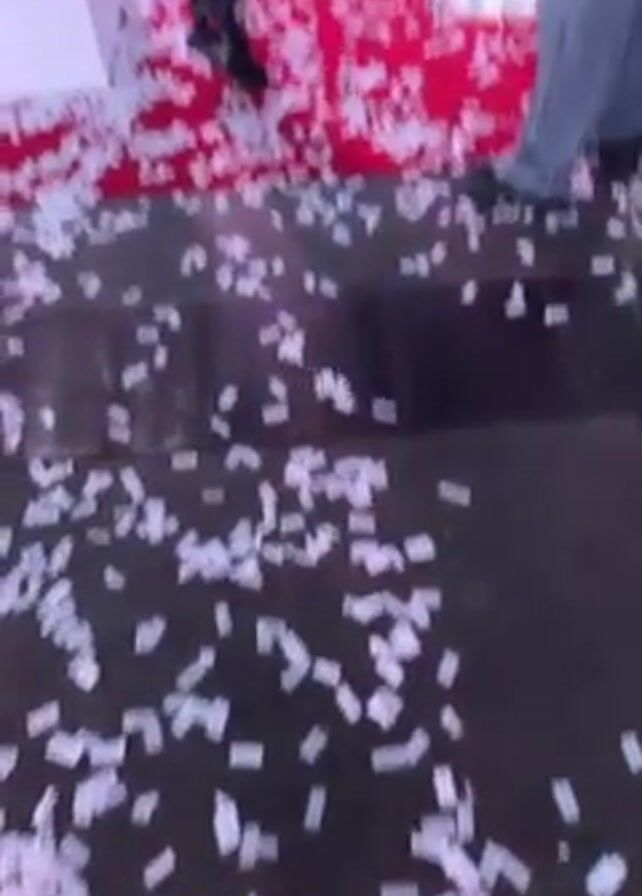 A crowd of people are celebrating, with a red carpet and confetti on the floor