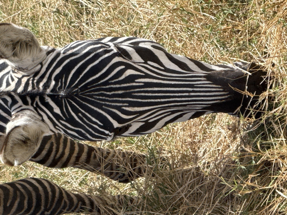 - "A zebra is captured from a high-angle perspective, head down, grazing on dry, yellowed grass interspersed with sparse green patches" by FM-ohOUo2, licensed under CC BY 4.0