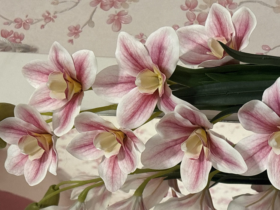 The image displays an indoor close-up of a decorative artificial floral arrangement in Munin, Syria. Multiple artificial flowers dominate the frame, each featuring pink petals with distinct white edges and a central yellow-cream pistil. Fine veining is visible across the petal surfaces. Dark green artificial stems and leaves are interspersed throughout the arrangement. The background consists of a light-colored wall adorned with a subtle, repeating pattern of pink floral motifs. No individuals are present in the scene.