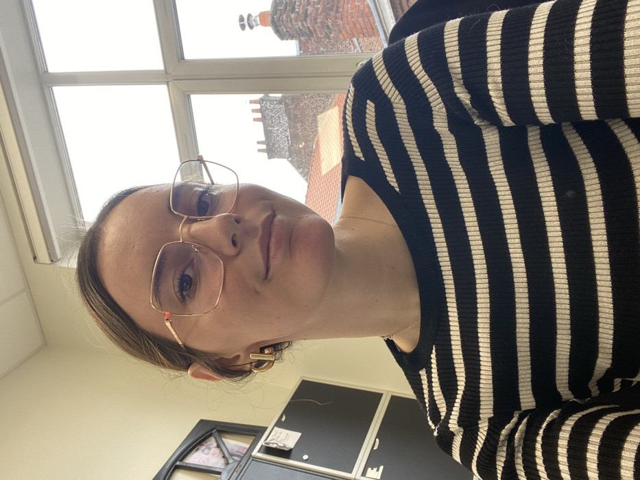 A female subject is centrally positioned, facing the viewer with a slight smile. She wears gold-framed, square-shaped eyeglasses and gold-colored geometric hoop earrings. Her light brown hair is pulled back, and a thin gold-colored necklace chain is visible. She is dressed in a black and white horizontally striped, ribbed long-sleeved top. The scene takes place indoors in the city of Lille, France. A large, white-framed multi-pane window occupies the right background, revealing an overcast white sky above. Below the sky, red-brick buildings with orange-red tiled roofs are visible. Two distinct brick chimneys stand out: one on the right features a rounded cap, and another on the left displays multiple flues. To the subject's left, a dark cabinet or shelving unit is partially visible, featuring what appears to be a framed item on top and a white note attached to one of its dark surfaces. The interior wall is a light, neutral color. Overhead lighting and a white window blind are partially visible at the top of the frame.