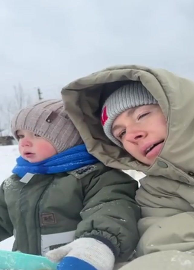 A close-up shot shows a young adult and a toddler in a snowy environment