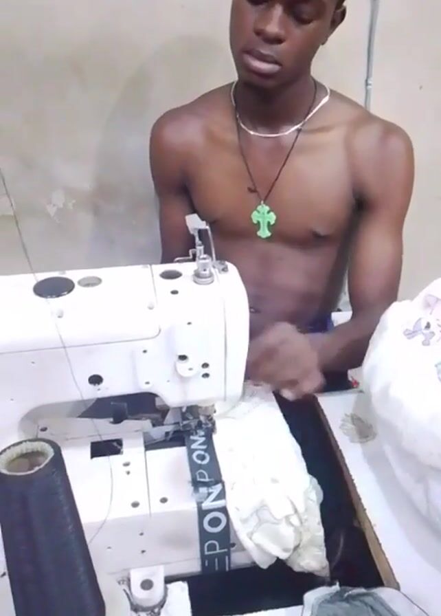 A shirtless young man is sitting at a white sewing machine. He has a silver chain around his neck with a green cross pendant. He is using the sewing machine to stitch a piece of light-colored fabric. To the left of the sewing machine is a large cone of black thread. Behind the man is a white wall. There is a white fabric with pastel images on the table to his right.