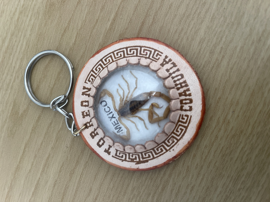 - "A circular keychain, featuring a preserved scorpion encased under a clear resin dome, rests on a light wood grain surface" by FM-0vEwu2, licensed under CC BY 4.0