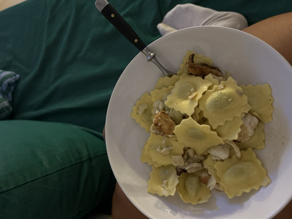 The scene, located in Yaiza, Spain, captures a close-up, downward-angled view of a white ceramic bowl containing pasta and protein, held on the lap of an individual. The bowl is filled with numerous yellow, scalloped-edged pasta squares, characteristic of ravioli. Interspersed among the pasta are irregular pieces of cooked, light-colored meat, some with browned exteriors, and a few darker, possibly mushroom-like, elements. A metallic fork with a black handle is partially submerged in the food on the right side of the bowl. The person's bare, tanned thighs support the bowl. A white crew sock is visible on the individual's right foot, positioned to the right of the bowl. The immediate environment consists of dark green upholstered furniture or bedding, with a dark green cushion visible in the upper left and a striped green and white fabric fragment in the upper right.