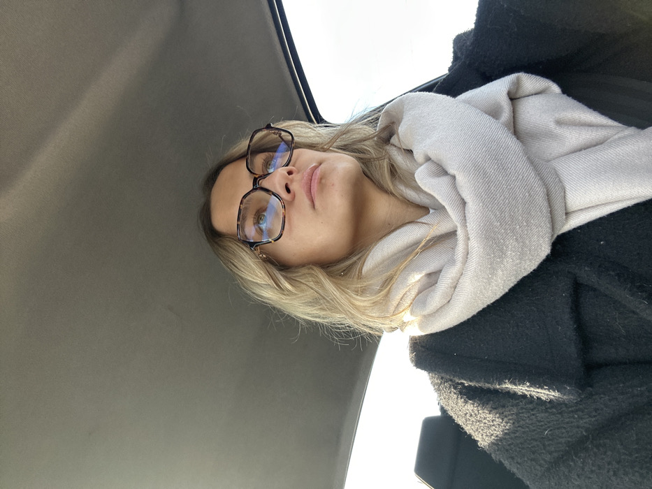 A young female, appearing to be the sole occupant, is depicted seated in the interior of a vehicle in Veauche, France. The subject has shoulder-length blonde hair and is wearing large, dark-rimmed glasses with blue light reflections. She is dressed in a dark, textured coat and a light beige scarf wrapped around her neck. Her head is tilted slightly upwards, and her gaze is directed towards the upper right side of the frame. The immediate environment consists of the vehicle's light grey ceiling and a window frame visible on the right. Natural light illuminates the scene from the right, suggesting daytime conditions. No specific actions or interactions are occurring beyond the subject's posture and gaze.