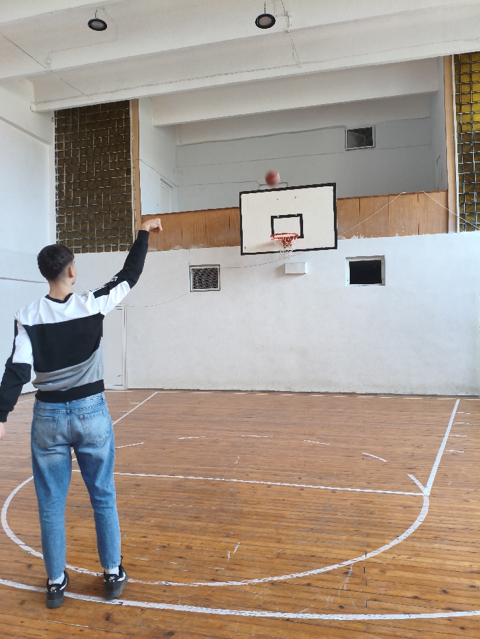 An indoor gymnasium in Dobrich, Bulgaria, is depicted with a male subject in mid-action. The subject, viewed from behind, is positioned on a wooden basketball court marked with white lines, including a three-point arc and key area. He wears a long-sleeved, multi-paneled sweatshirt in black, white, and gray, blue jeans, and black athletic shoes. His right arm is extended upwards and forward, consistent with the follow-through of a basketball shot. A standard basketball, orange-brown in color, is visible in the air directly above the rim of a wall-mounted basketball hoop, which features a white rectangular backboard with a black outline, an orange rim, and a white net. The wall behind the hoop is white, with two smaller rectangular openings below the wooden paneling; the left opening has a grate, and the right appears dark. Above the white wall is a section of light brown wooden paneling, topped by a white architectural structure with beams and recesses. To the left, a large rectangular section of the upper wall contains a grid-like brown paneling. To the right, a similar large section contains yellow-tinted, grid-patterned glass blocks. The white ceiling features exposed beams and two circular, flush-mount light fixtures with visible wiring.