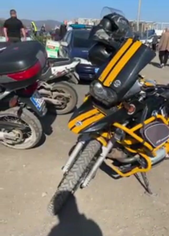 motorcycle parked outdoors on a gravel surface, followed by shots of a police car and two more motorcycles. The first motorcycle is a black and yellow BMW, with a crash bar, a helmet, and a tank bag. It's parked at an angle, facing the camera. The surrounding area appears to be a gathering place, with people walking around and other vehicles parked nearby. The video pans left to show a police car. The next motorcycle is white with black markings. A red Honda CBR600RR is parked near it. The Honda is in very good condition. The surrounding area has a building on one side and more vehicles in the background. The day is sunny and bright.
