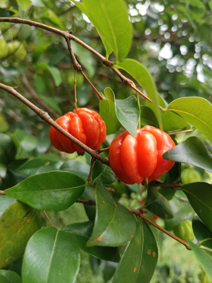 - "Two bright red Surinam cherries hang from a thin, brown branch amidst vibrant green foliage" by FM-WRTkH2, licensed under CC BY 4.0