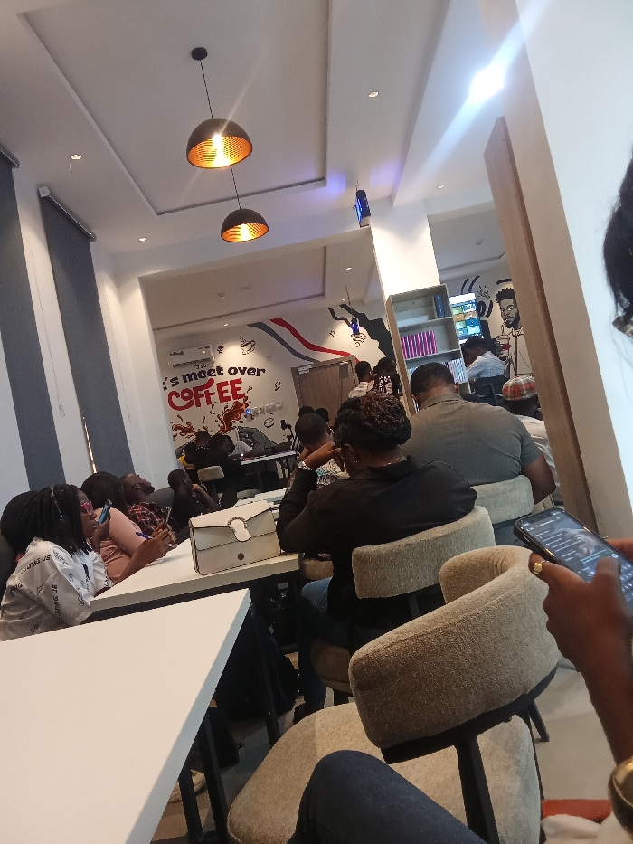 The scene depicts the interior of a modern café or coffee shop, located in Ikeja, Nigeria, populated by approximately ten to fifteen individuals, primarily adults