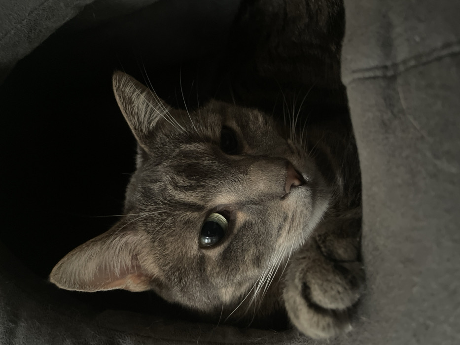 - "A grey tabby domestic cat is depicted resting within a dark grey, soft, enclosed pet bed" by FM-5j9vB3, licensed under CC BY 4.0