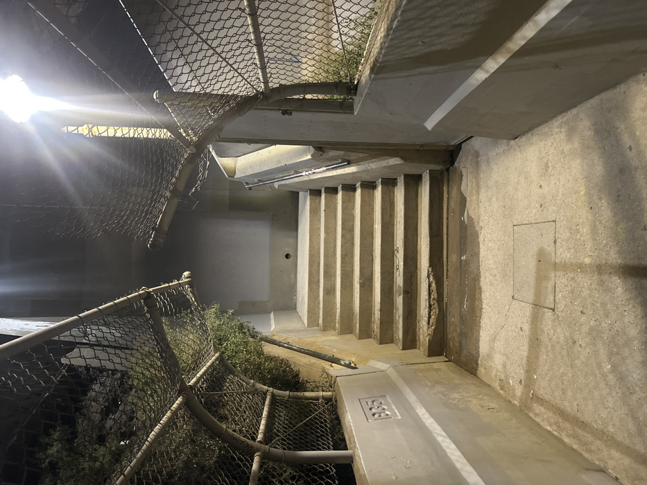 This image depicts a concrete pedestrian underpass stairway at night, located in Santa Monica, California, likely beneath the California Incline near Ocean Avenue. The scene is illuminated by artificial light sources, predominantly from the upper right. The central feature is a set of approximately seven concrete steps ascending into a dark tunnel-like structure. The bottom step and the concrete landing area display dampness and some surface cracks, with a square utility cover embedded in the ground. The edge of the second step from the bottom exhibits noticeable concrete crumbling. Concrete retaining walls flank the stairs. The wall on the left features an embossed rectangular panel containing the numbers "835". A metal handrail is affixed to the right wall alongside the stairs, with a partially obscured one on the left. Overhanging chain-link fences, curving inward, top both concrete walls, indicating they are part of a bridge or overpass structure above. Dark foliage is visible behind the left-side fence. No individuals, actions, or interactions are present in the scene.