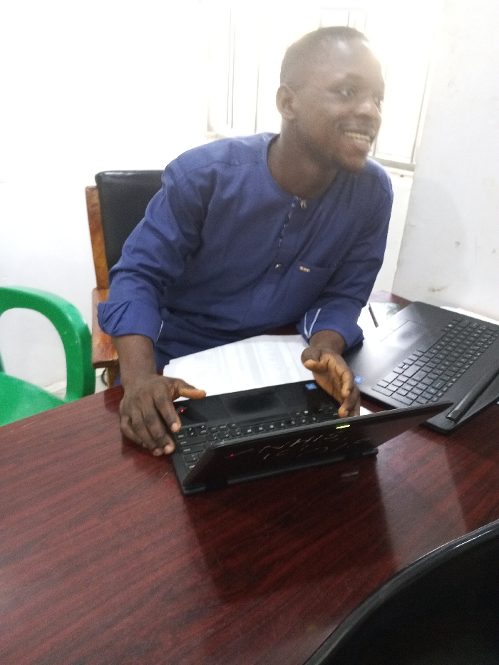 The image depicts an indoor scene in Lokoja, Nigeria, likely an office or workstation