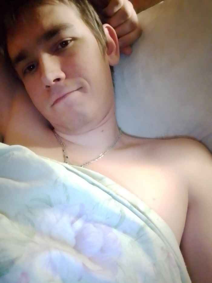 A young man reclines under a floral-patterned blanket. He has short brown hair, light skin, and is wearing a silver chain. His expression is neutral, with a slight pursing of the lips. He rests his head on a pillow, the back of his hand visible near his ear. The background is soft and out of focus. The scene is softly lit, suggesting an intimate or relaxed setting.