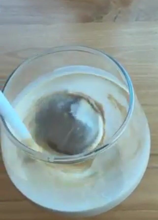 A person with manicured nails is stirring a drink with a white straw. The drink is in a round, clear glass with a spherical ice cube inside. The liquid appears to be a mix of coffee and milk or cream, with swirling patterns visible as it's being stirred. The glass is sitting on a light-colored wooden surface.