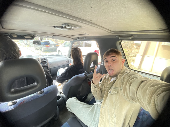 The image captures the interior of a vehicle from a rear passenger seat, depicting three occupants and the exterior environment of a street in Plovdiv, Bulgaria. In the foreground, on the right, a male individual with light brown, faded hair is taking a selfie. He is wearing a light tan denim jacket over a white top and light grey sweatpants. His left hand forms a "rock on" gesture, his tongue is extended, and his eyes are wide, directly addressing the camera. Ahead of him, in the front passenger seat, the back of a person with long, dark brown hair in a dark hooded sweatshirt is visible. To the left, in the driver's seat, the back of another individual with dark hair and a dark top is seen. The vehicle's interior features a light grey headliner with a visible sunroof and black headrests on the front seats. The rear seat upholstery is blue with a dark pattern. The dashboard is grey. Through the front windshield, a narrow, paved street in Plovdiv, Bulgaria, is visible. A dark-colored sedan is parked on the left side, facing away, and a white van or SUV is further down the street on the right. A building with light-colored walls is visible through the right side window. The scene is illuminated by natural daylight, captured with a wide-angle perspective.