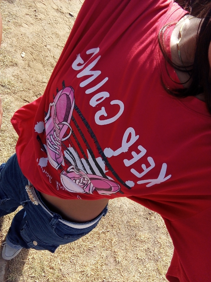 The image depicts a high-angle, downward view of a person, likely female, standing outdoors in Porlamar, Venezuela, under bright daylight. The subject is wearing a red short-sleeved t-shirt with a white graphic design that includes the phrase "KEEP GOING" (partially inverted and reversed due to orientation) and an illustration of two pink athletic shoes. Blue denim jeans, a white belt with a silver-colored buckle positioned on the right hip, and a single light-colored sneaker on the left foot are visible. A small section of the abdomen is exposed between the t-shirt and jeans. Dark hair is visible draped over the subject's right shoulder/chest area, where a thin gold-colored necklace or chain is also present. The ground consists of dry, yellowish-brown grass and patches of bare soil or sand. No other individuals or specific landmarks of the city are discernable.