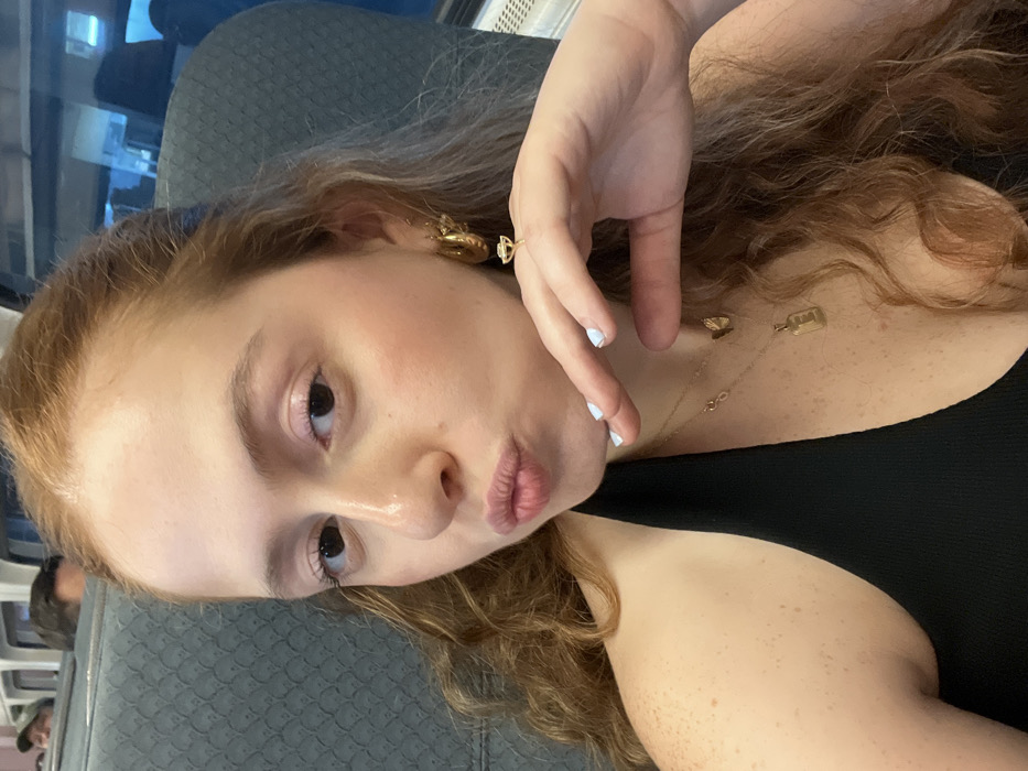A young adult female with reddish-brown wavy hair and fair skin is depicted in a close-up, selfie-style photograph
