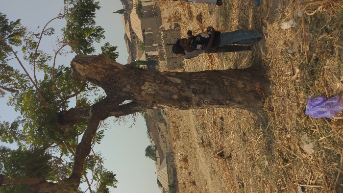 A large tree with dense green foliage stands prominently against a sun-drenched landscape. The tree's trunk is thick and textured. Adjacent to the tree, two individuals are observed, and in the background, buildings can be seen. Dry grass and scattered debris, including a blue plastic bag, cover the ground.