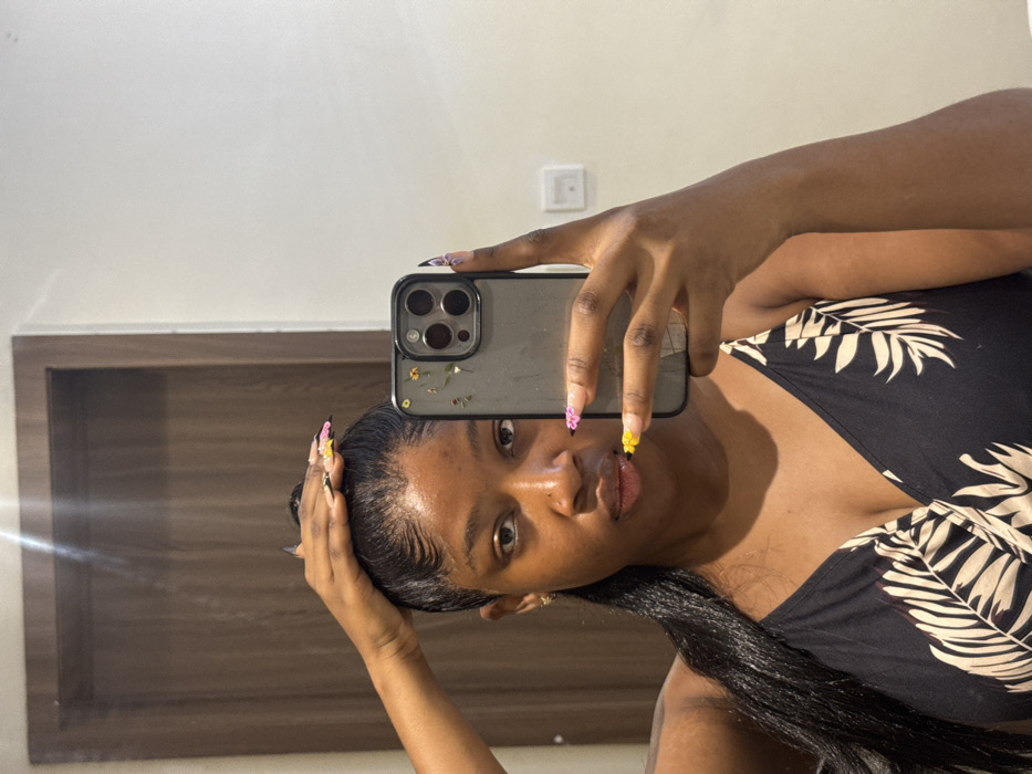 The scene is set indoors in the city of Ojomu, Nigeria. A female individual, of dark complexion, is captured in a mirror selfie. Her long, dark, straightened hair is pulled back, with styled baby hairs visible along the hairline. She wears a black spaghetti-strap top featuring a light-colored leaf pattern. Her left hand is raised, with fingers resting on the top of her head near the hairline. Her right hand holds a smartphone, partially obscuring the lower right side of her face. The phone is encased in a dark, decorated cover, and its triple-lens camera module is visible. The individual has long, manicured nails with multi-colored designs (pink, yellow, and black tips). A stud is present in her left nostril, and a small earring is visible in her left ear. The background consists of a plain, light-colored wall to the right and a dark brown wooden door with vertical paneling to the left and top. A white electrical outlet or light switch is mounted on the wall behind her right shoulder.