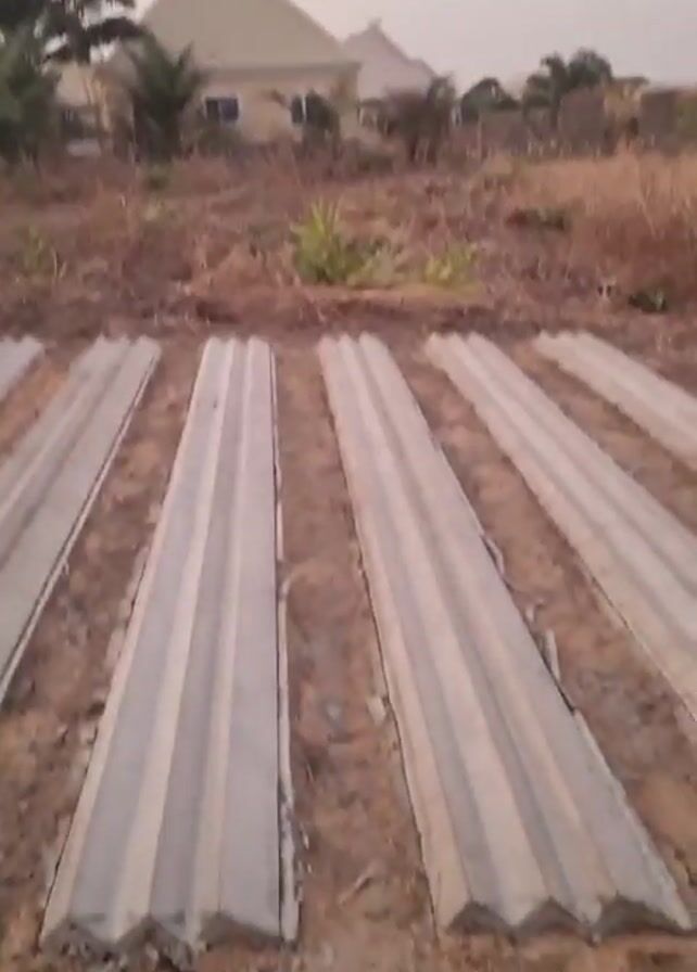 several long, narrow, gray concrete structures, possibly fence posts or building components, lying horizontally on bare dirt ground. The pieces are ribbed. Behind them is a patch of dry grass and weeds. In the background are houses, suggesting a residential area or construction site. The sky is overcast. There are no people or actions visible in the video.