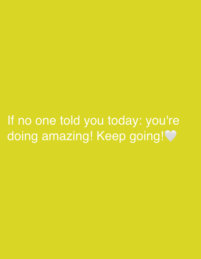 The image displays a solid, uniform yellow background. Centered horizontally in the lower portion of the frame is white text presented in a sans-serif font, reading: "If no one told you today: you're doing amazing! Keep going!" A white heart emoji is appended immediately after the word "going!". There are no discernible individuals, objects, actions, or environmental features present in the image that would indicate a specific location within the city of Varna, Bulgaria, or any other physical setting.
