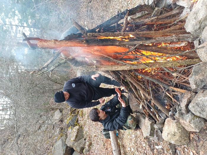 In the city of Vladaya, Bulgaria, an outdoor scene features three individuals gathered around a large, actively burning bonfire. The bonfire is constructed from numerous branches and logs arranged in an upright, conical structure, with its base ringed by natural rocks. Significant flames and smoke emanate from the fire. A young male in the left foreground, wearing a dark puffer jacket and camouflage pants, crouches with his hands extended towards the fire, appearing to warm himself. To his right, a standing adult male, wearing a black beanie and dark clothing, observes the fire with his right hand near his knee. A third individual is partially obscured by the flames and smoke on the right side of the bonfire, their arms visible, possibly tending to the fire. The surrounding environment consists of uneven ground covered with dry leaves and scattered rocks, with bare trees and large boulders visible in the background, suggesting a natural, possibly wooded, area under an overcast sky.
