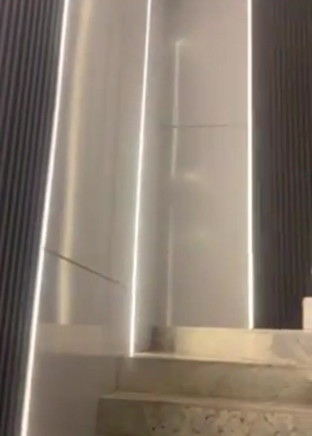 The camera pans upwards, showcasing a staircase with light grey marble steps in an indoor environment. The walls surrounding the staircase are a combination of light grey panels and dark grey vertically corrugated surfaces. A thin, bright vertical light strip runs along the edges of the wall panels. A security camera is visible near the top of the staircase. The staircase railing on the right side is white with dark vertical bars and a wooden handrail.