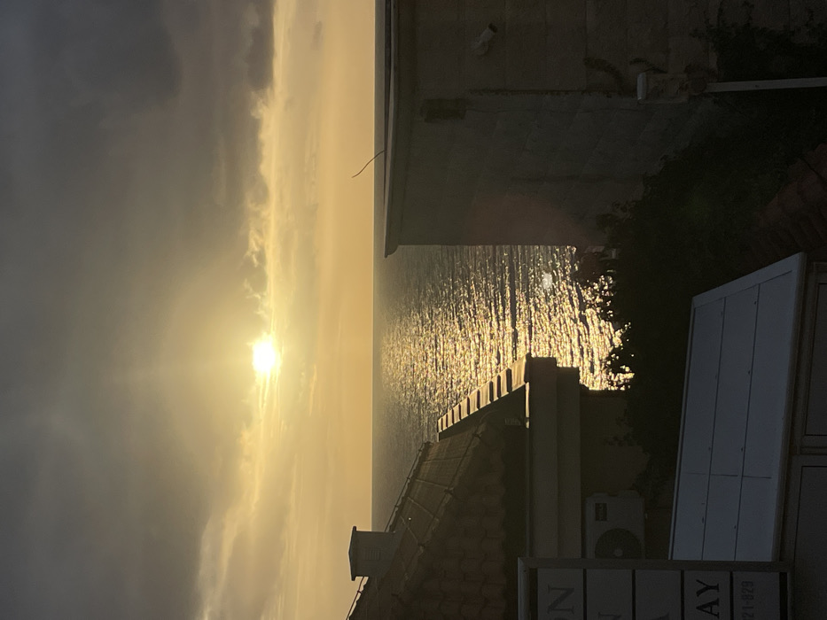 The image displays a sunset or sunrise over the sea, likely the Adriatic Sea, observed from an elevated perspective in Sveti Stefan, Montenegro. The sun, a prominent bright golden orb, is positioned slightly left of the frame's vertical center in the upper half, casting intense light through scattered clouds. These clouds range from luminous golden yellow near the sun to darker gray in the upper right. A distinct, shimmering path of golden light reflects off the rippled water surface, extending from the sun towards the foreground. In the lower-left quadrant, a building with a dark, red-tiled gabled roof and a chimney is partially visible, primarily in silhouette. An external air conditioning unit is mounted on its facade below the roofline. Below this, a vertical sign, mostly in shadow, displays partial white text including "ON," "A," "AY," and "021-929." A flat, light-colored roof structure is situated at the bottom left. The lower-right quadrant features a light-colored, block-constructed building wall terminating in a flat roof. A dark, thin pipe or conduit extends horizontally from its upper right side, and a slender, dark, curved wire or plant stem protrudes vertically from its flat roof. Dark vegetation is discernible in the mid-ground, silhouetted between the structures and against the illuminated water. No individuals are present in the scene.
