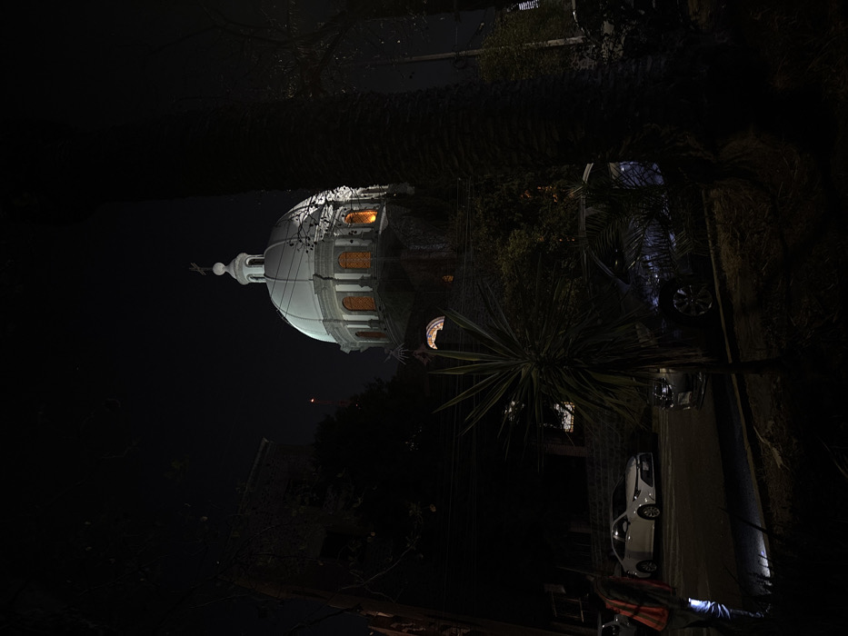The image displays a nighttime street scene in Puebla, Mexico, featuring the Templo de Nuestra Señora de La Soledad. The church's prominent white dome, topped with a cupola and a cross, is brightly illuminated against the dark sky. Several arched windows within the dome's base emit an amber glow. The lower sections of the church structure are darker, partially obscured by surrounding trees and dense foliage. In the left foreground, a person is visible from the back, wearing an orange reflective vest over dark clothing and dark pants. They are holding a flashlight, directing its beam downwards onto the dark ground immediately in front of them. On the street, a white sedan, identifiable as a Toyota Corolla model, is parked on the left. A second, darker vehicle, possibly an SUV, is partially visible on the right, positioned behind a spiky, yucca-like plant and other vegetation. A large, dark palm tree trunk stands vertically on the far right side of the frame. Overhead power lines are visible horizontally in the mid-ground. A faint red light source appears in the distant background to the left of the church dome.
