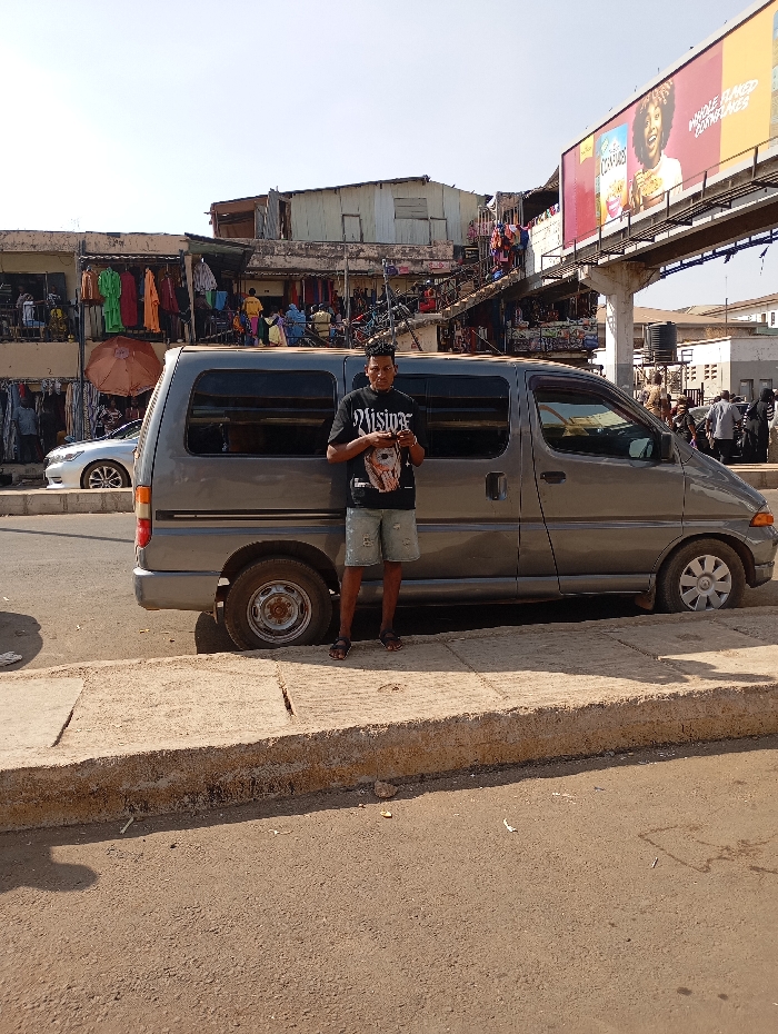 A street-level photograph depicts a bustling urban scene in Jos, Nigeria, under a clear sky. A dark grey minivan is parked parallel to a concrete curb on the right side of an asphalt road in the midground. A young man, of dark complexion with short, dark hair, stands beside the driver's side of the minivan, facing the camera. He wears a black t-shirt with a white graphic print, light-colored shorts, and dark sandals, holding a small dark object in both hands at waist height. The minivan's front left wheel features a steel rim, while the front right wheel has an alloy-type rim. In the background, a multi-story market building with open stalls lines the street. The lower level displays various colorful garments on hangers, with an orange umbrella visible near one stall. A crowded staircase ascends to upper levels where numerous people and merchandise are visible. The upper sections of the building exhibit exposed concrete and corrugated metal structures. Above the building, a large billboard on a concrete overhead support structure advertises "Whole Flaked Cornflakes" with an image of a smiling woman. Additional buildings and a black water tank are visible on a rooftop in the far right background. The foreground consists of a cracked concrete sidewalk and a dirt/asphalt road. Pedestrians are observable throughout the distant background, contributing to the market's activity.