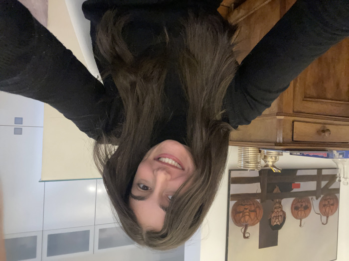 The scene is an indoor residential setting in Montpellier, France. A young adult female with long, dark brown hair and wearing a black turtleneck top is centrally positioned, smiling broadly and looking directly at the camera. Her left arm is partially visible in the lower right quadrant, indicating she is holding the camera for a self-portrait. In the background to her left, a wooden credenza or cabinet holds a clear glass decanter, a blue and red Rummikub board game box, and several silver-toned decorative objects. Above the credenza, a framed painting depicts four carved pumpkin faces resting on a wooden fence, with a gaunt, pale-faced figure in a dark suit positioned behind the fence. To her right, modern white kitchen cabinets with horizontal frosted glass panels are visible, along with a light-colored wall section and a portion of a white chair.