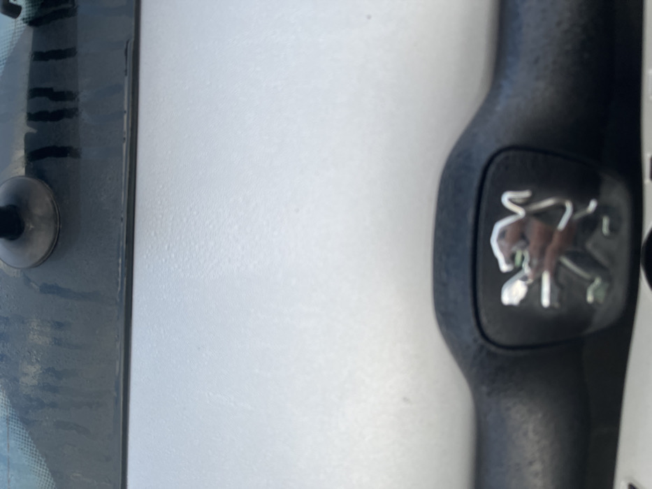 The image presents a forward-facing view from inside a vehicle situated in Brežice, Slovenia. The upper section displays the interior surface of a windshield, marked by visible condensation or streaks, and includes a black suction cup mount attached to the glass in the upper left quadrant. The central portion of the frame is occupied by a light-colored surface, presumably the vehicle's hood or a dashboard reflection, which exhibits numerous small, irregular surface anomalies or textures. The lower part of the image features a black, textured plastic trim piece. Centered within this trim is a reflective, chrome-colored Peugeot lion emblem. No individuals or discernible actions are present in the scene.