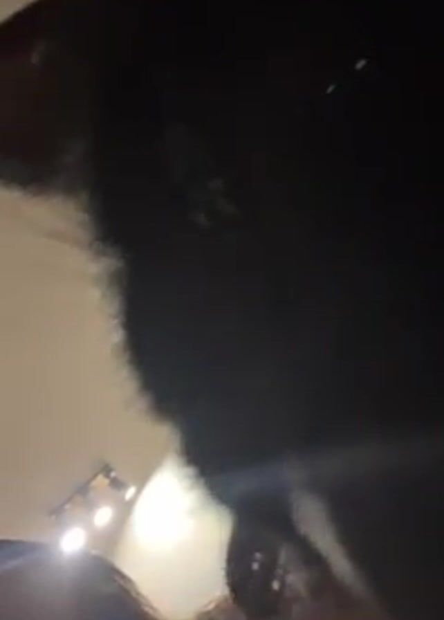 close-up of a black cat's head from a low angle. The cat appears to be looking down at someone lying on their back. The person's hair is visible. In the background, there is a ceiling with lighting fixtures. The cat makes a snuffling sound.