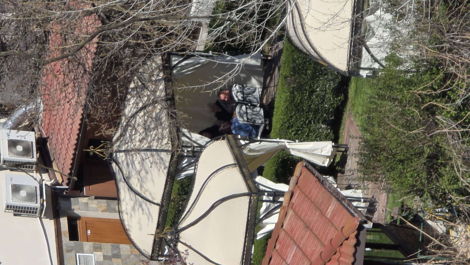 n outdoor dining area in Marulevo, Bulgaria. Several tables with curved white awnings are present. Two people are seated at one of the tables under an awning. The surrounding environment includes trees, bushes, and buildings with red-tiled roofs. Air conditioning units are visible on the side of one of the buildings. A brick path is also apparent.