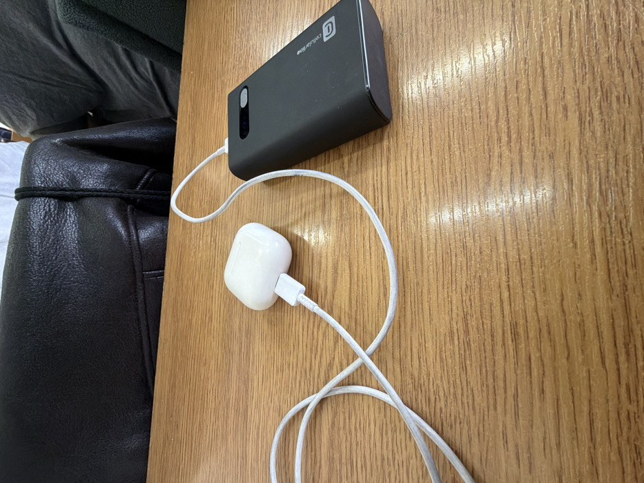 The image displays a close-up, high-angle view of two electronic devices connected by a white charging cable, positioned on a wooden table. **Subjects/Objects:** The primary subjects are a white Apple AirPods charging case, positioned on the left, and a rectangular, black power bank, identified by the "cellularline" logo and a "C" icon, located on the right. A white cable, consistent with a Lightning connector, extends from the charging port of the AirPods case and plugs into the power bank. The power bank features a small, rectangular digital display on its top surface, which appears illuminated with a light grey or blue hue, indicating activity. The power bank has a slightly rounded bottom edge. The AirPods case is glossy white, while the power bank has a matte black finish with glossy accents. **Actions/Interactions:** The cable indicates that the AirPods case is actively charging from the power bank. No people are visible or directly interacting with the devices in the frame. **Environment:** The devices rest on a light brown wooden table surface with a visible wood grain pattern and some reflective glare. In the blurred background, a dark, possibly black, leather upholstered chair is partially visible on the left, with another dark, possibly fabric-covered, object or chair to its right. The setting appears to be indoors. **Location:** The image lacks identifiable landmarks, signs, or unique architectural features that would confirm a specific location within the city of Sofia, Bulgaria. The environment suggests a generic indoor setting such as a cafe, office, or waiting area.