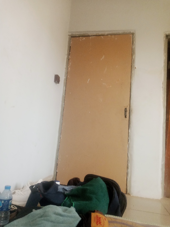 An indoor scene in Ado, Nigeria, depicts a room undergoing construction or renovation. A light brown, possibly unpainted or primed wooden door, occupies the center-right of the frame, set within a white-painted wall. The door frame is unfinished, displaying exposed plaster or cement. White splatters, consistent with paint or plaster, are visible on the door's surface. A dark, rectangular slot, possibly for a lock or handle, is present on the right edge of the door. To the left of the door, a small, dark brown rectangular object, possibly an electrical fixture, is mounted on the white wall. In the lower left foreground, a clear plastic water bottle with a blue cap and partial label rests near a pile of assorted textiles, including a dark blue garment, a folded green cloth, and a lighter blue/grey cloth. A pair of white sneakers is partially visible behind the textiles. The floor is light-colored, possibly tiled. To the far right, a portion of another unfinished doorway is visible. No individuals are present.