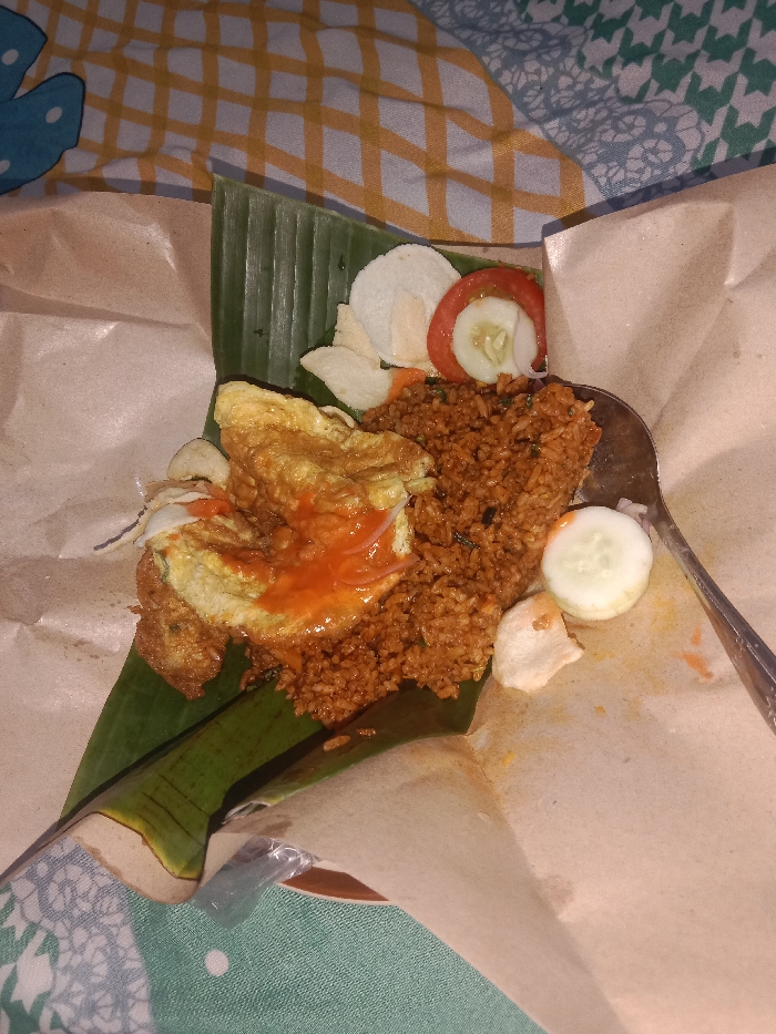 - "The image displays a single serving of Indonesian Nasi Goreng (fried rice) presented on a banana leaf, contained within a brown paper wrapper, resting on a patterned textile surface" by FM-4aAs33, licensed under CC BY 4.0