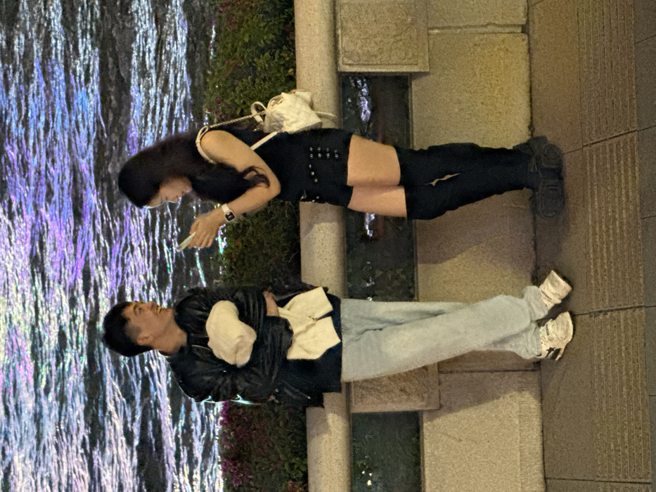 The scene, set at night in Haizhu District, China, depicts two individuals standing on a paved promenade adjacent to a body of water. A male subject, positioned on the left, of Asian ethnicity with short dark hair, is smiling and looking towards the female. He wears a black leather jacket, light blue jeans, and white sneakers, holding a light-colored hat and a second light-colored garment. The female subject, positioned on the right, of Asian ethnicity with long dark hair, is observing a white smartphone held with both hands. She wears a black sleeveless top, black shorts with decorative metal eyelets, and black thigh-high boots with substantial platform soles. A white smartwatch is visible on her left wrist, and a quilted, light-colored handbag with a chain strap hangs from her right shoulder. The immediate background consists of a concrete barrier, behind which is dense green foliage interspersed with pink flowers, separating the subjects from the dark, rippling water surface that reflects purple and blue artificial light.